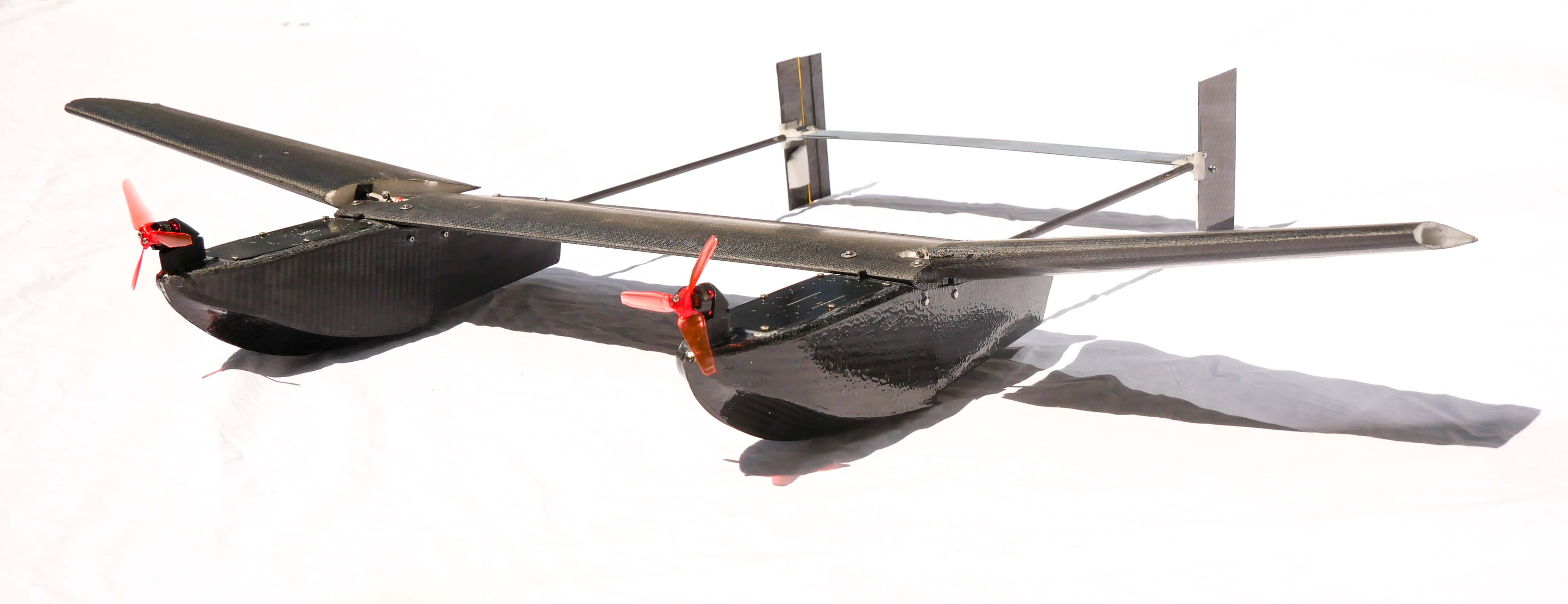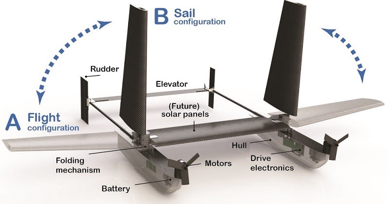 Fixed-wing robots are high-efficiency devices through their use of aerodynamic lift. This permits long-distance mission, significantly widening the application spectrum. The sailing-flying robot stems from the requirement for a robot to both possess the flexibility and range of flight yet be capable of performing long-duration missions in contact with the water for monitoring. The core aerodynamic concept of this original project lays in using the same high-performance wings for flight and for sailing. This provides long distance flight and power-neutral surface locomotion. This concept was developed extensively through models and prototyping. It led to contributions in hybrid control, conceptual robotics design, manufacturing processes and unified electronics framework. The research was published in the Robotics and Automation Letters 2019 and presented at the International Conference on Robotics and autonomous systems.
