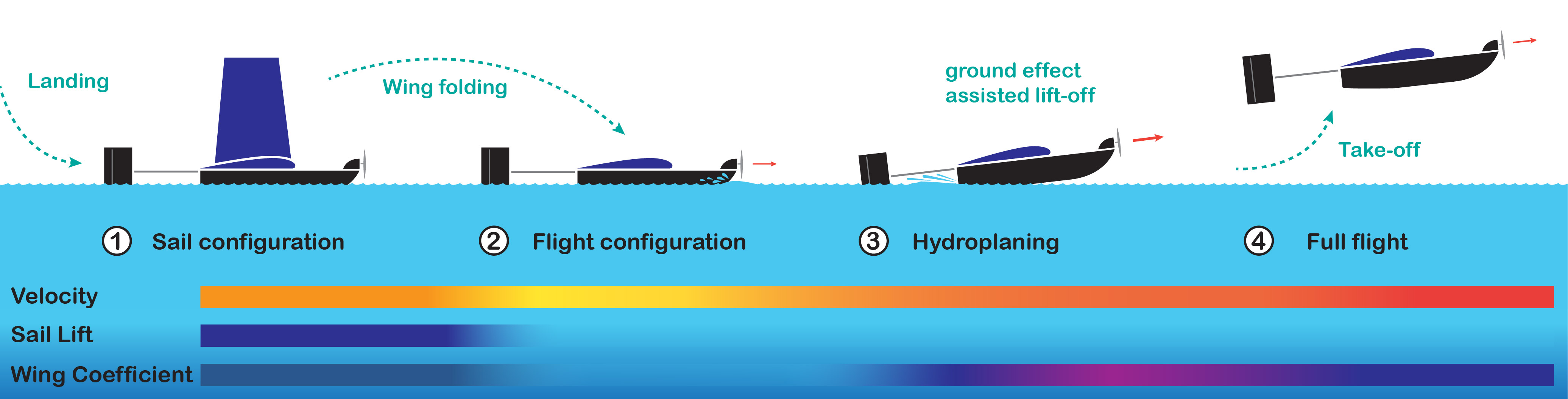 Sailing-flight cycle overview. The robot lands on water where it transitions to a sailing configuration and executes its mission. Take-off is achieved via propelled acceleration, transitioning from displacement vessel regime, to hydroplaning and lastly to being fully airborne.
